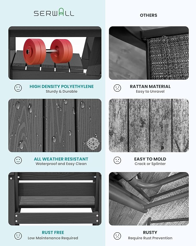 - 【Low Maintenance】HDPE dining table sets required low maintenance. Unlike the Steel dining sets may require rust prevention, SERWALL patio dining table and chairs are easy to clean with just soap and water, requiring minimal effort to keep them looking fresh.