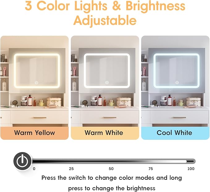 - 【Sliding Mirror】 The vanity desk comes with a mirror that can be adjusted to three different color options. Whether you need warm, cool, or natural lighting, this vanity desk provides the perfect setting for your makeup routine. This allows you to customize your makeup application to suit your preferences.The mirror also hides a hidden storage shelf, allowing you to keep your cosmetics and skin care products within easy reach.