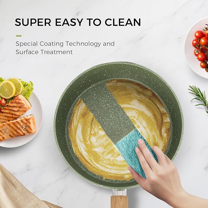 - Nonstick Granite Stone Coating: The pots and pans set features a durable granite stone coating that ensures easy food release and quick cleanup. The coating is also scratch-resistant and safe for use with metal utensils