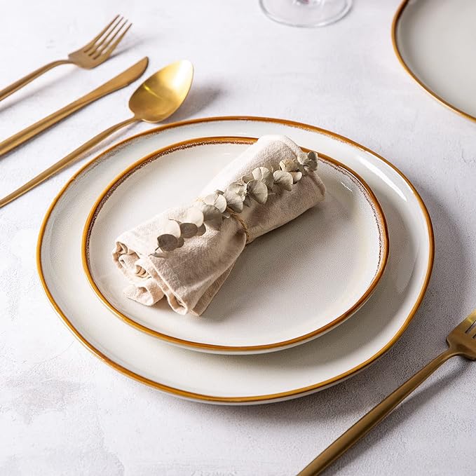- EVERY PLATE IS UNIQUE: This dinerware set are fired with two different glazes, so the surface develops a beautiful color and makes your food look even more delicious.The reactive glaze make every plate is unique, Since our glaze is all-natural, the surface of plates would change color on different lighting. The color may be a tad different from what you see in the image,but very item is betiful.Our glaze is also extra strong to prevent scratches from your knives and forks.