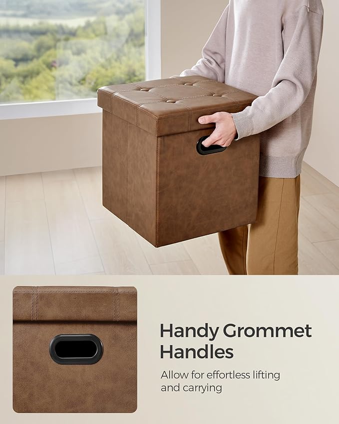 SONGMICS Mazie Collection - 15 Inches Ottoman with Storage, Footstool, Storage Ottoman with Metal Handles, Load 660 lb, for Dorm, Living Room, Bedroom, Synthetic Leather, Coffee Brown ULSF030K01
