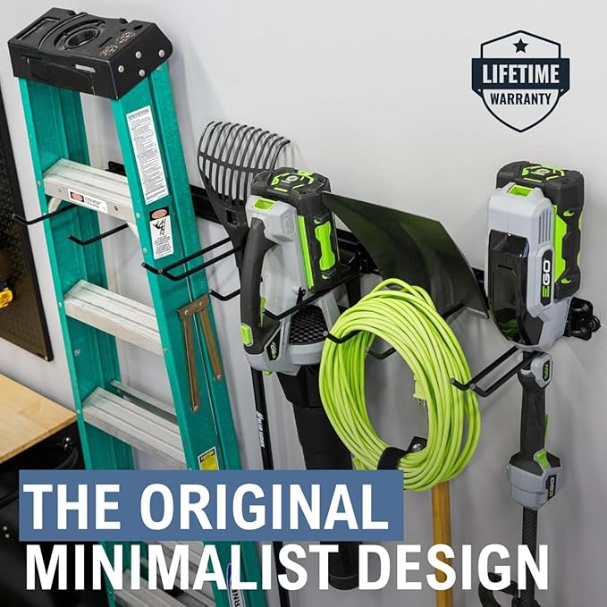 - INCLUDES 48" STORAGE RACK SYSTEM – Features modular wall hangers and wall shelves with expandable hooks that create a complete garage wall organizer. Dimensions: 48" wide with multiple tool storage organizer slots to secure yard tools, broom holder wall mount, and more.
