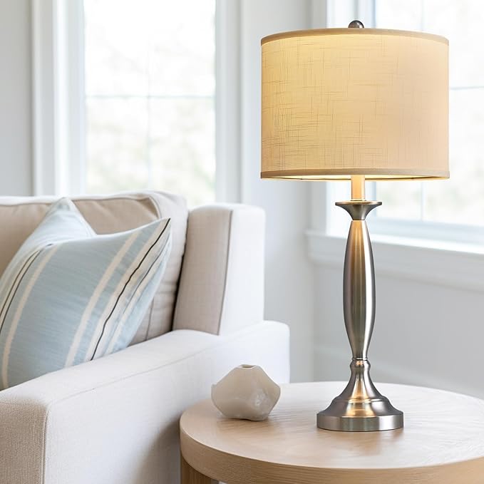 - Minimalist &Modern Design: The set of 2 bedside lamps are constructed of high-quality silver metal base and linen fabric lamp shades that provide a modern feeling aesthetic. Table lamp for living room is perfect in living room bedrooms, bedside, café, corridors, restaurants, etc. It displays a warm and beautiful atmosphere to a room.(Note: The shade needs to be assembled)