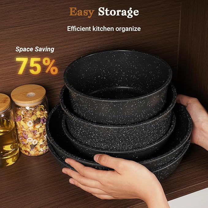 - Space-saving Design - Removable handles of pots and pans set allow for compact stacking, maximizing space savings of up to 75% for cabinets, apartments, RVs, and campers.