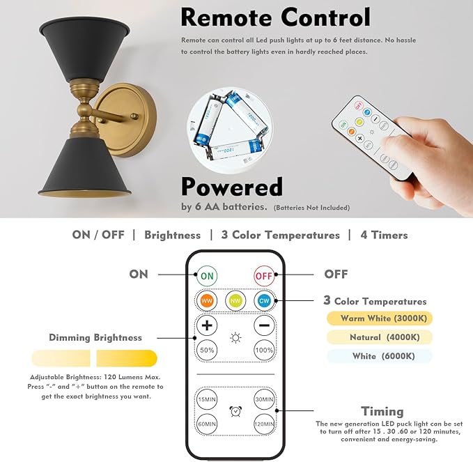 - Easy to Operate: Multi-function remote control Which is a remote control for turn on/off the black wall light, adjusting correlated color temperature (CCT) from warm white, nature white to cool white, and it is also a timing-switch