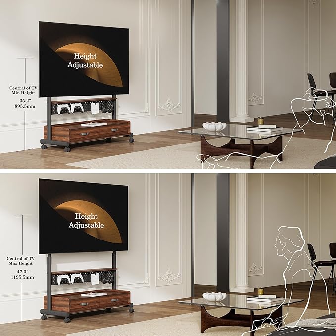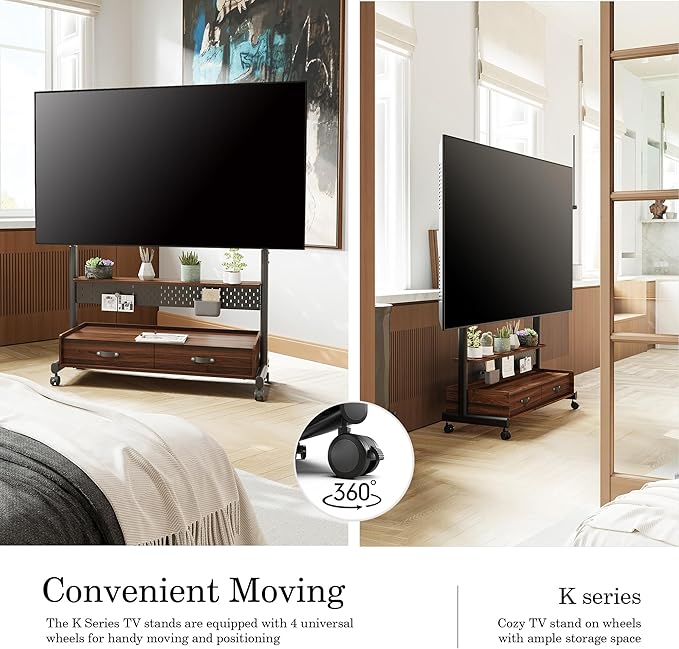 - 【Effortless Movement with Smooth Rolling Wheels】Imagine freely gliding your TV from the living room to the bedroom or patio with sleek FITUEYES rolling TV stand. Equipped with smooth, quiet wheels with brakes, it ensures stability when stationary and convenience when moving. A perfect mobile tv stand on wheels for home gathering, office meeting, hotel showcase, and school teaching.