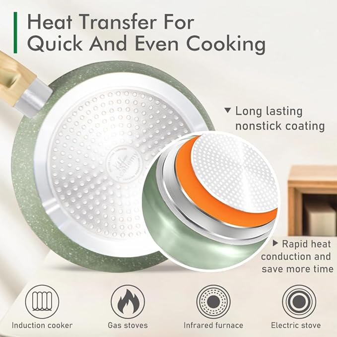 - ๐๐จ๐ง๐ฌ๐ญ๐ข๐๐ค ๐๐จ๐ญ๐ฌ ๐๐ง๐ ๐๐๐ง๐ฌ ๐๐๐ญ: The non-stick material allows light oil and less fumes, and the pan set is wear-resistant and lightweight, which enhances the experience of stir-fry cooking and makes cooking healthier