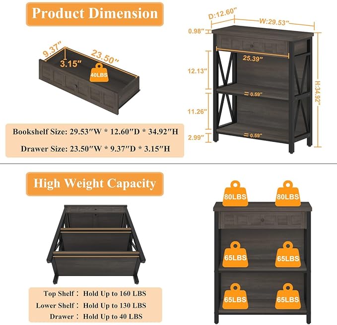 - [Impressive Stability & Weight Capacity] Thanks to additional support rods under lower shelf, this low bookshelf stands stable and secure after assembly. The weight limit of the shelf top is 160 lbs, and the lower shelf is 130 lbs. The drawer can handle up to 40 lbs. We have also added adjustable levelers on each leg to achieve perfect flatness