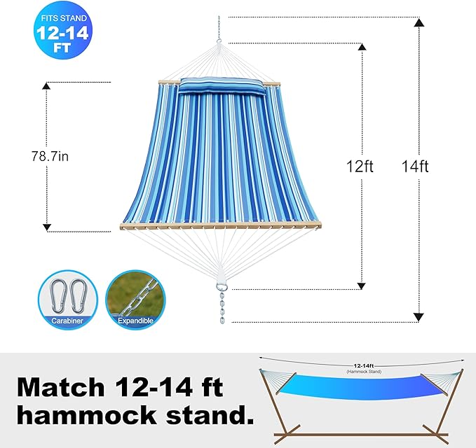 - ✅UPGRADED DOUBLE HAMMOCK & SPACIOUS ENOUGH TO SHARE: The comfort that comes with extra space is vital to us, and its size also boasts a wider range of versatility, allowing it to be hung from a 12-14ft hammock stand (not included) or used outdoors on its own.The hammock bed's dimension is 78.7" L * 55" W, the length from chain to chain is 14', larger than other quilted hammocks.