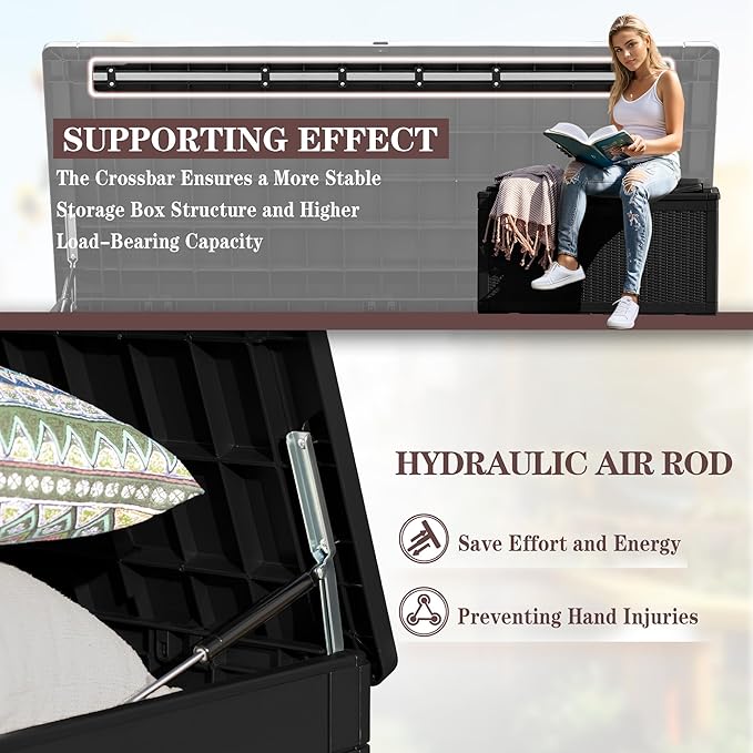 - PRACTICAL DESIGN: The deck box has a hydraulic holder design, which can prevent your hand from being caught when you open and close the box to ensure safety. Meanwhile, there is a support bar designed inside the lid, which can enhance the durability of the storage box.