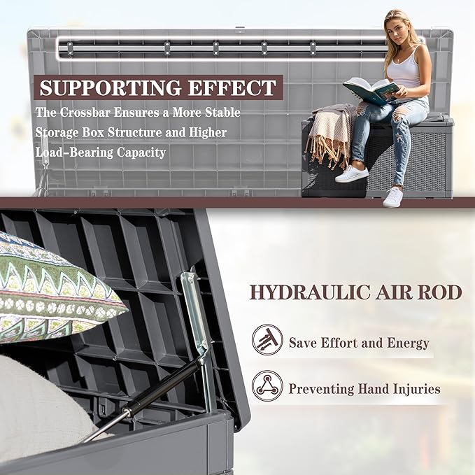 - PRACTICAL DESIGN: The deck box has a hydraulic holder design, which can prevent your hand from being caught when you open and close the box to ensure safety. Meanwhile, there is a support bar designed inside the lid, which can enhance the durability of the storage box.