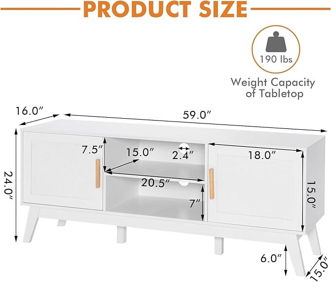 - Classic Design with Rattan Decor: The elegant design and classic white finish adds to the aesthetic appeal of the entertainment unit and helps it blend well with your modern decor. The exquisite rattan doors provide a warm, natural touch. This entertainment TV cabinet is a stunning addition to any living room, game room or bedroom.