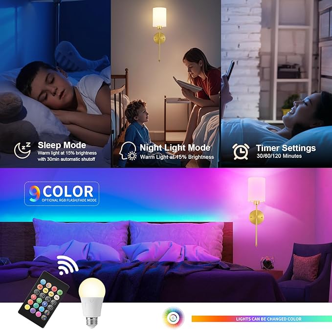 - SCONCES WITH REMOTE CONTROL: The wireless wall light comes with a remote control, offering a range of features such as adjustable brightness (10-100%), customizable color temperature (amber light/warm white/neutral white/daylight), 9 RGB color options, timer settings (30/60/120 minutes), and a convenient one-touch sleep mode and night light function