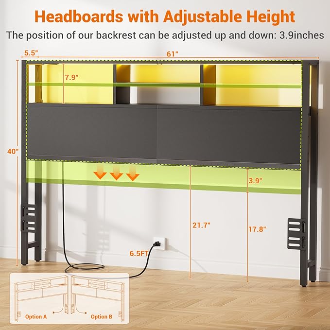 Aheaplus Headboard for Queen Size Bed with Storage, Headboards with Outlets, USB Ports and LED Light, Queen Size Head Board Only, Height Adjustable, Reversible, Sturdy and Stable Headboard, Black