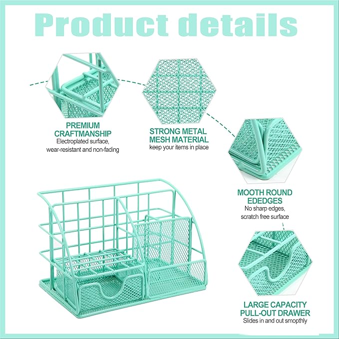 - 【Elegant Desk Organizers】Our cute and stylish desktop organizer features 5 separate compartments and 1 mini sliding drawer. The desktop organizer is adopting with a powder coat finish and electroplating technology ,wear-resistant, anti-oxidation, and long lasting and does not fade . The rounded corners metal rim and trim add to the visual appeal, and protect your desk.