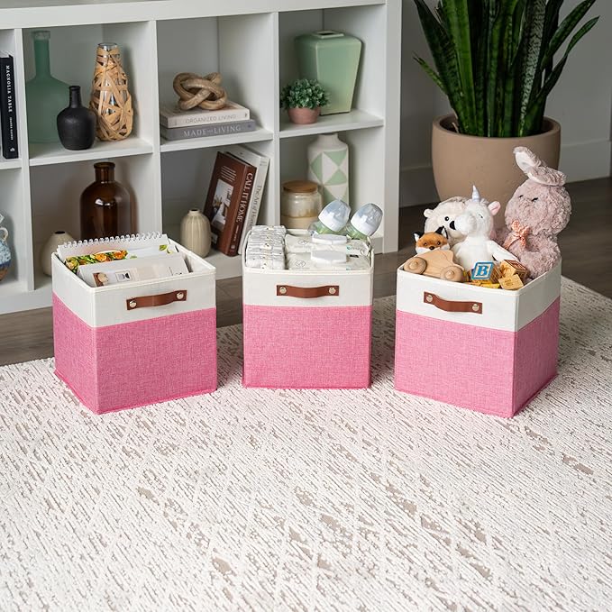- Decorative Fabric and Vegan Handle - These versatile 11 x 11 storage cubes baskets for organizing your everyday life are made with a thick, high-quality fabric and fitted with vegan handles to add a stylish touch to a living room, bedroom, office, or personal space.