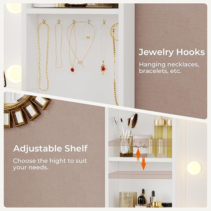 - 【Large Vanity with Ample Storage】48.8'' Large dresser comes with enough capacity storage. The spacious tabletop and 4 shelves are enough to hold your frequently used makeup items, 6 hooks can organize your bracelet or necklace and other tangle-prone items. The dressing table has 6 drawers and 1 side cabinet, which is perfectly able to hold all your stuff, the largest glass top drawer, not only can be used for DIY but also allows you to quickly find the makeup or jewelry you want.