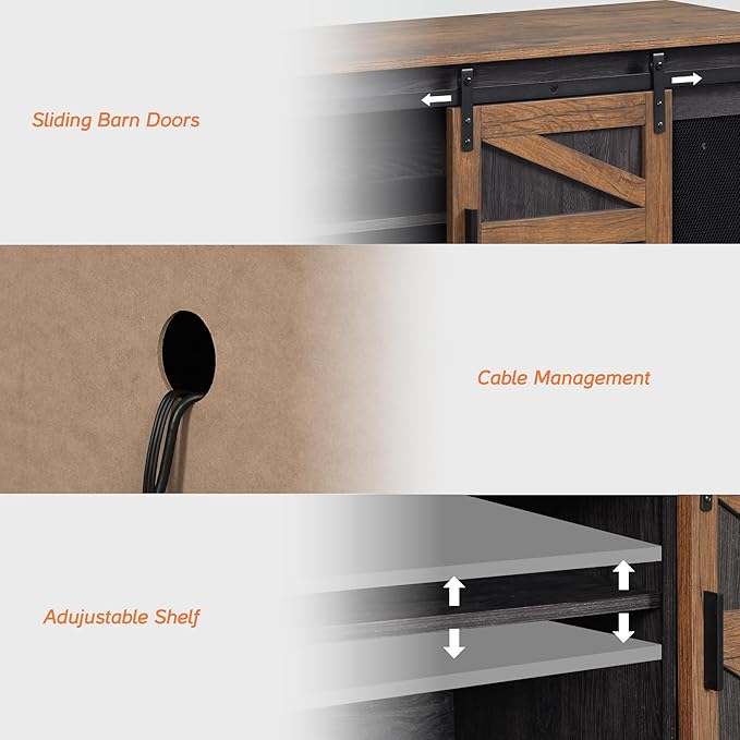 - Sliding Barn Doors:Our two sliding barn doors are designed with a special quality metal barn door pattern. Easy access to cabinets and shelves via metal track,,slide smoothly and quietly.