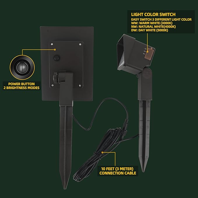 - ➽ MULTIPLE APPLICATIONS - The compact, powerful spotlight, 10ft connection cable and remote panel make this ideal for any outdoor lighting application. Light up a tree, house wall or column or use the included stake extender to point the heads down to light up a walkway, pathway or garden stone.