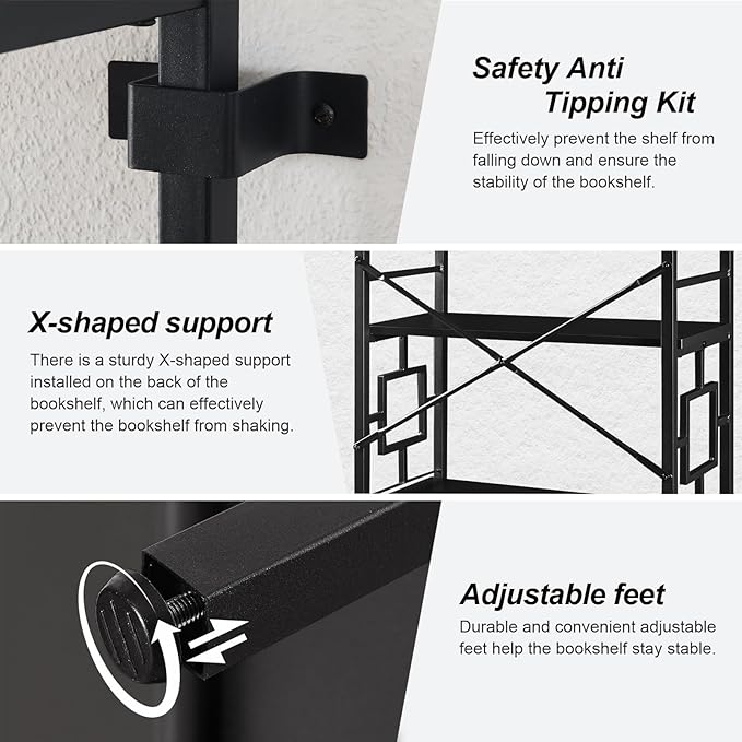 - 【Sturdy & Durable Shelf】The structure of the tall bookcase has been designed and improved for a long time. The X-shaped back and adjustable feet underneath ensure the overall structural stability of this black bookshelf that can be used for long periods without shaking. Overall dimensions of large open bookshelves: 84.4" high x 23.3" wide x 11.8" deep.