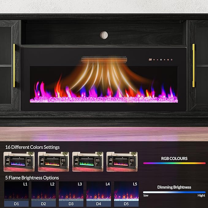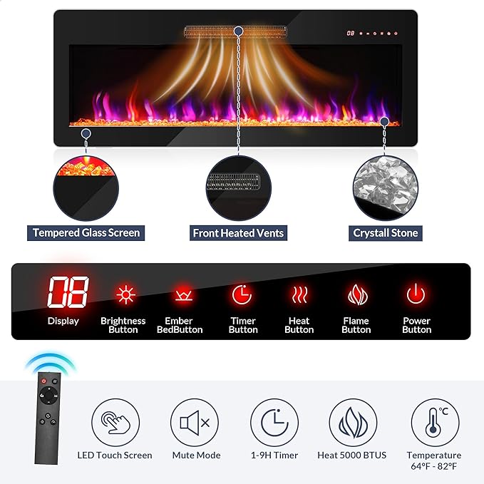 - [42-inch Touchscreen Fireplace] Enjoy a cozy and warm ambiance with the 16 color options, temperature range of 62°F-82°F, 1-9 hour timer, 5 adjustable brightness and flame speed, and separate control for flame and heat. The 1400W CSA/UL-certified fireplace can heat up to 400 sq. ft. and comes with an overheat protection feature. Accompanied by a tempered glass screen showing off a stunning flame effect, it will truly enhance your home entertainment experience.