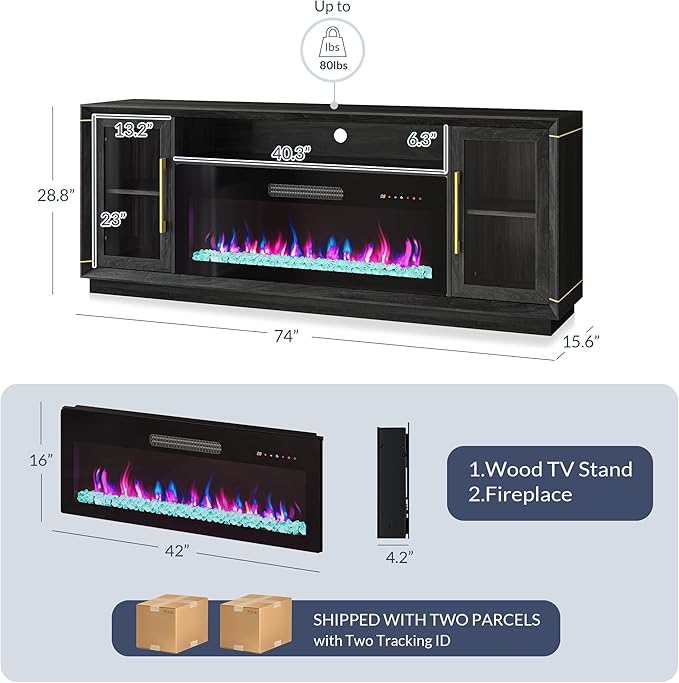 - [Easy Assembly] The package includes clear and detailed assembly instructions, allowing for easy assembly in just 90 minutes. The entertainment stand and fireplace are shipped in two separate packages, possibly arriving at different times. TV stand dimensions: L74''xW16''xH29'', weight capacity: 80 lbs; fireplace dimensions: L42" x W4" x H16".