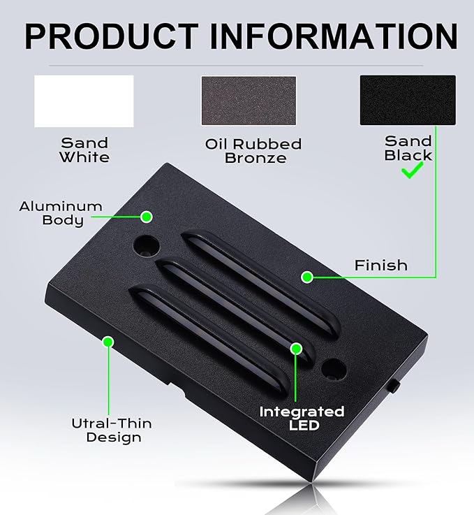 - ✅Classic Deisgn: The step lights come in an elegant black finish, adding a touch of sophistication and style to your outdoor decor. The timeless design seamlessly complements various architectural styles, enhancing the overall visual appeal of your outdoor spaces.