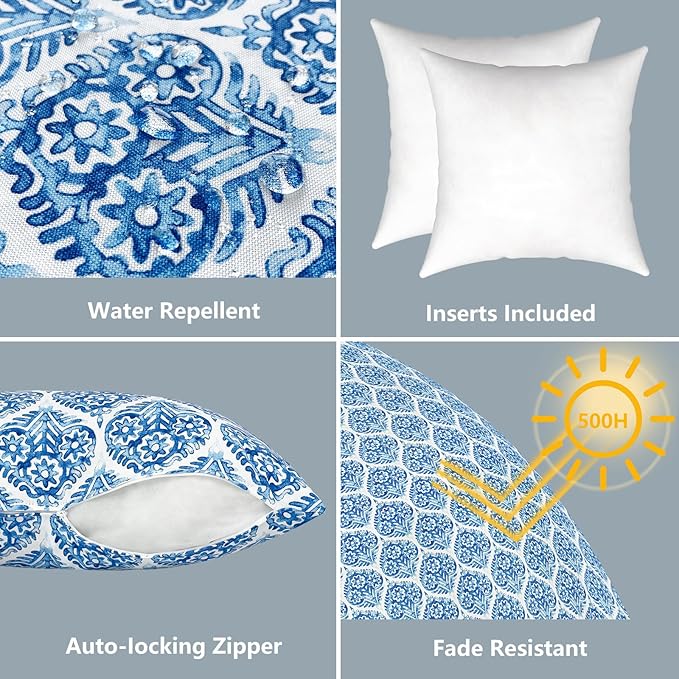 - MATERIAL - Our outdoor pillow is made of durable polyester fabric and soft polyester fiber. It's water repellent and fade-resistant, won't fading under the direct sunlight over 500 hours. The insert is filled with soft polyester fiber, overstuffed construction for enhanced comfort and longevity