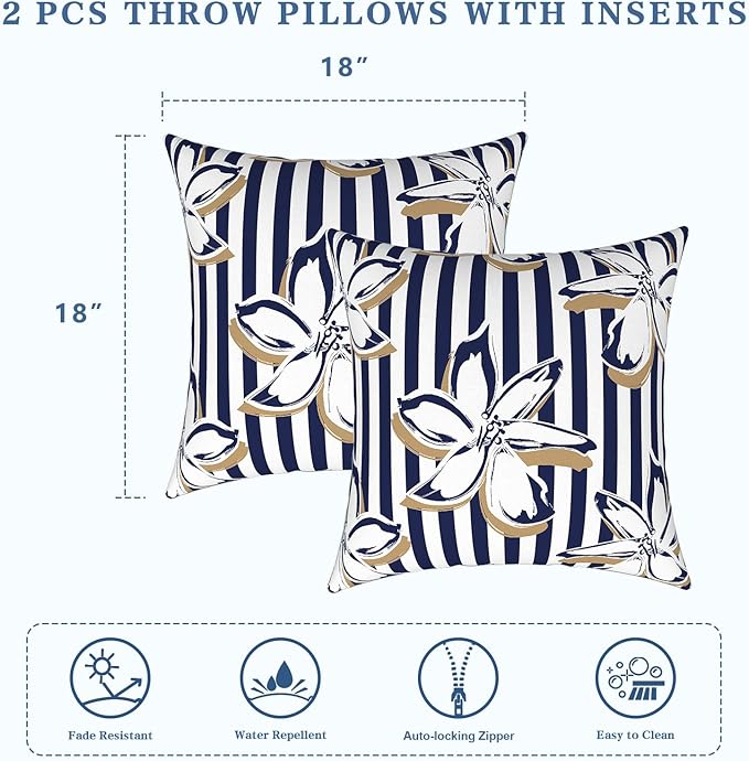 LVTXIII Outdoor/Indoor Throw Pillows, Decorative Throw Pillows with Inserts, 18"x18" Square Pillows for Bed, Couch, Sofa and Patio Furniture, Set of 2, Clemens Cabana Navy