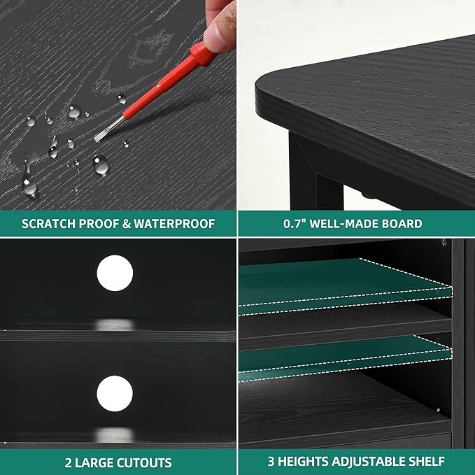 - Ample storage space & Space-saving: This corner TV stand features w/ 2 doors, top center adjustable shelf is for X-box, DVDs, speakers, game console or other items and extra 2 tiers shelf space on both ends can display your plants or decorations. Fits corners easily with hexagonal design. 2 cord holes are on the back to leaves enough space for the power cord. Mesh doors designed with soft closing hinges and magnetic catch, preventing fast, rough closures to protect your doors and no noise