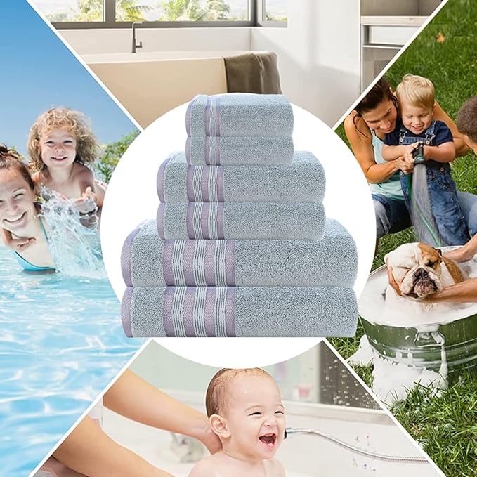 - INGREDIENTS: Set includes 2 large bath towels measuring 27 x 55 inches, 2 large hand towels measuring 16 x 28 inches, 2 washcloths measuring 12 x 12 inches.