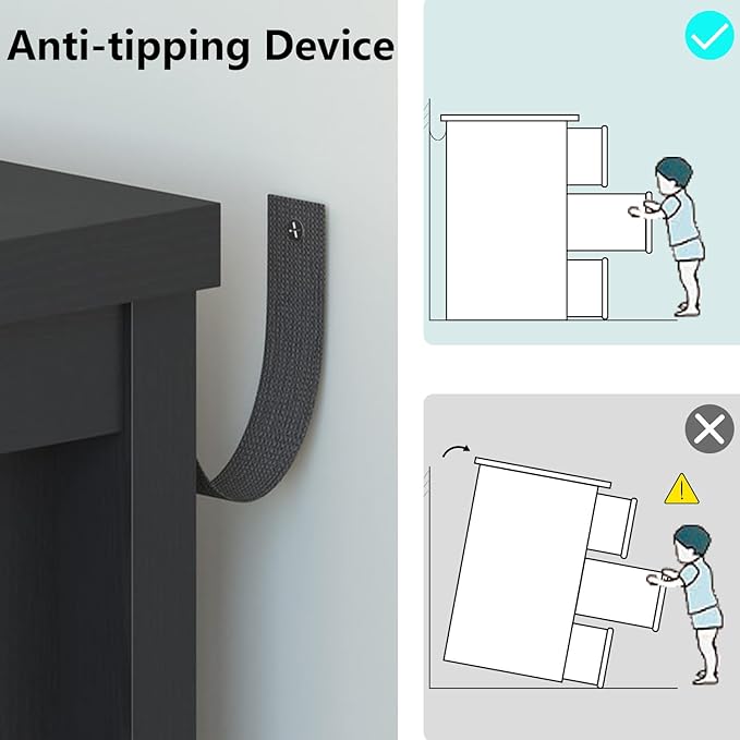 - 【ANTI-TILTING AND STATLE】The sturdy frame gives the modern dresser enough support, black dresser tabletop can bear up to 220lbs and 30lbs for each drawer. The anti-tip device hook it to the wall that ensures that you and your family can use this double dresser safely and durably.