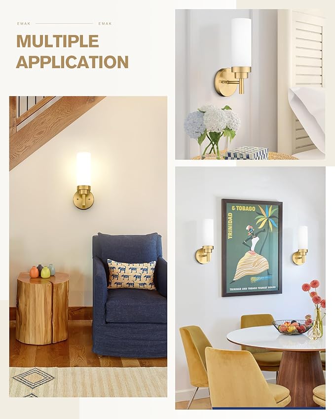 Emak Wall Sconces Set of 2, Modern Brushed Gold Bathroom Vanity Sconce Wall Lighting with Milk Glass Shade for Bathroom, Bedroom, Living Room, Hallway, WS085-BGD-ML-2PK