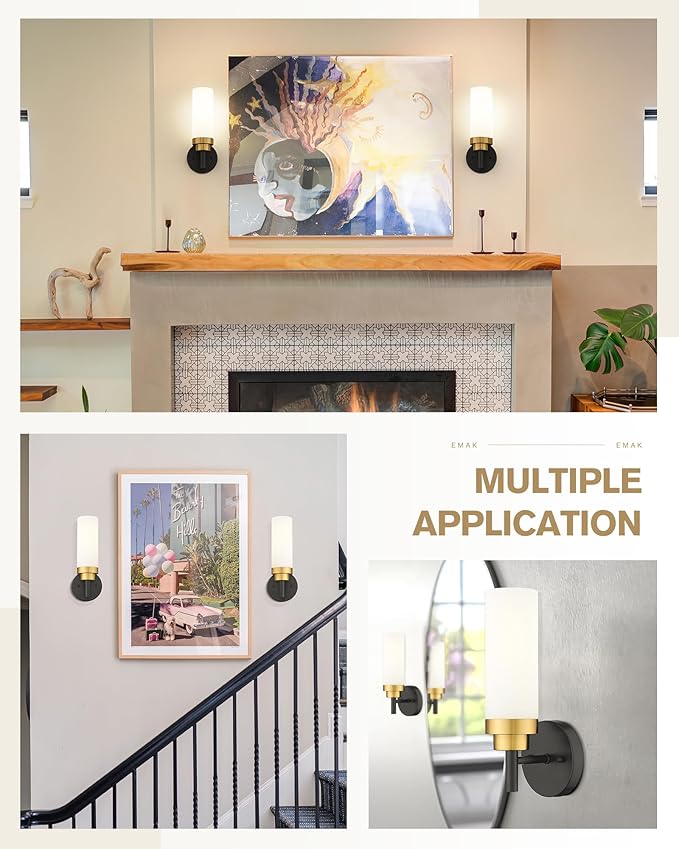 Emak Modern Wall Sconce, Black Gold Bathroom Light Fixtures with Milk Glass Shade, 2 Pack Wall Lamp for Bathroom, Bedroom, Living Room, Hallway, WS085-BKBGD-ML-2PK