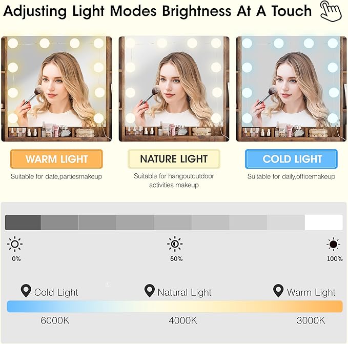 - Make up Vanity with 10 LED Bulbs: Square large mirror, with 3 color modes lighting: warm light, natural light and bright white, create the perfect lighting for applying makeup and hair styling.