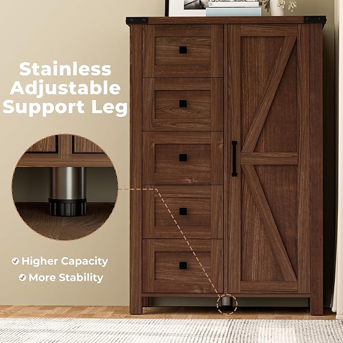 Farmhouse 48 Inch Tall Dresser Chest of Drawer for Bedroom, 5 Drawer Storage Cabinet with Barn Door, Adjustable Shelves, Rustic, for Living Room, Entryway, Hallway, Cherry Wood