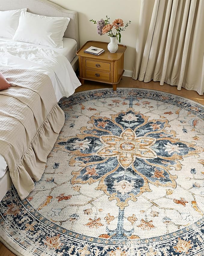 Area Rugs 8ft Washable Non-Slip, Floral Vintage Distress Print Pattern Medallion Carpet for Living Room Bedroom Dining Room, Beige Navy Blue Orange Colorful