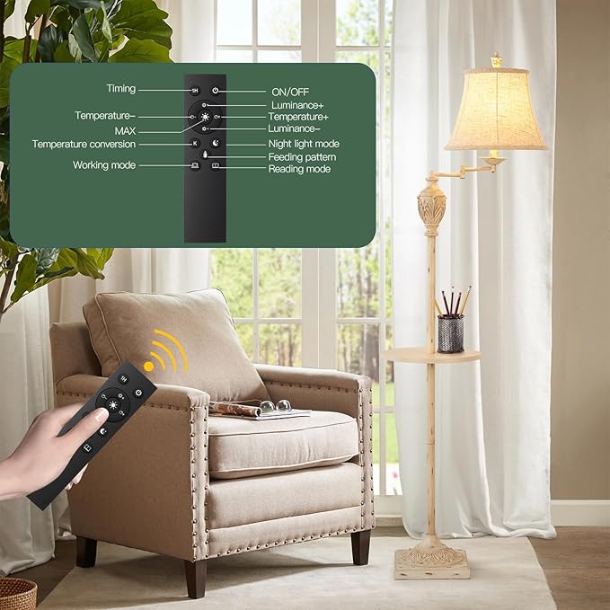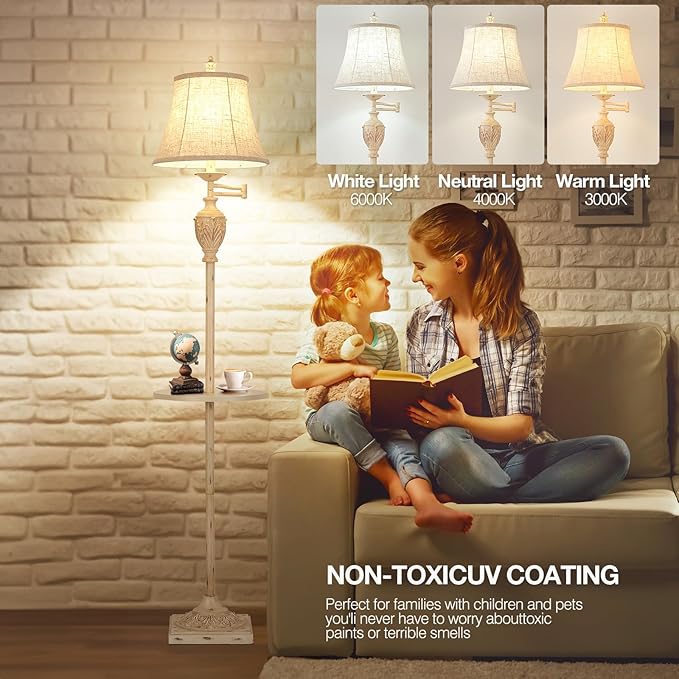 - TABLE AND ELEGANT LAMPSHADE-- We upgraded the Lamps,The middle part of the floor lamp has added a tray for you to place your belongings, or put a cup of coffee in the leisure time is also good. The lampshade is made from durable faux silk fabric, which makes the light soft, eye friendly and is easy to clean.