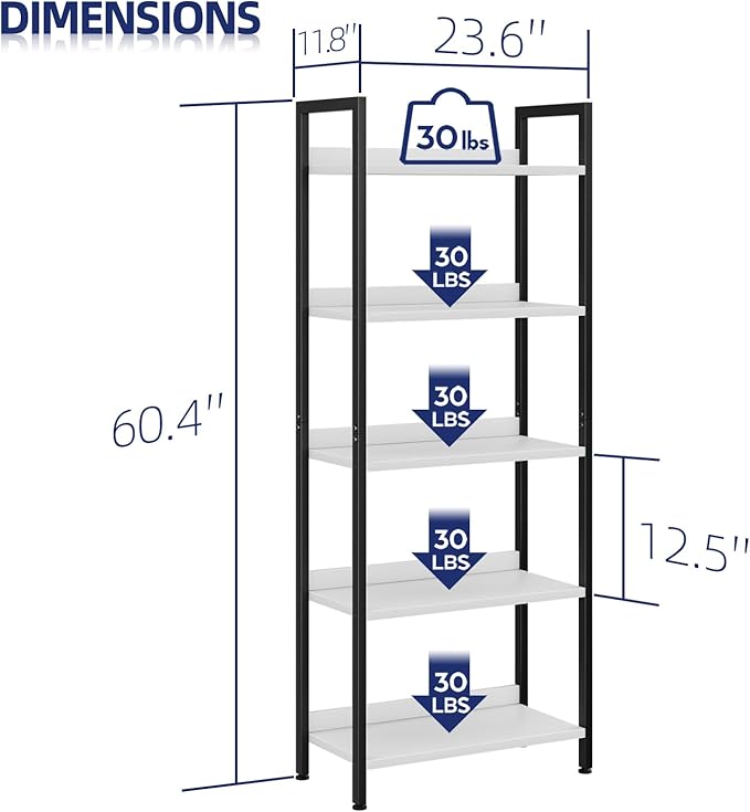 - 【5-TIER OPEN MULTIFUNCTIONAL BOOKSHELF】This 5 shelf bookshelf provides a very wide storage space, you can use it to place all kinds of items as you see fit. Books, photo albums, crafts, potted plants and etc. Beautiful bookshelf panel with waterproof and anti-scratch features, very easy to clean. Overall size: 23.6 * 11.8 * 60.4 inches (L * D * H)