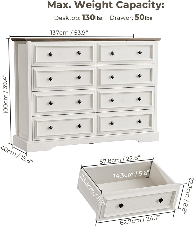 - Ample Storage Space: Measuring 53.9" W x 15.8"D x 39.4"H and with 8 spacious drawers, it offers plenty of room to organize your belongings. Whether it's clothing, linens, or miscellaneous household items, you can neatly tuck them away. The drawers glide smoothly on metal runners, ensuring easy access and quiet operation. Say goodbye to clutter and hello to an organized and tidy home.
