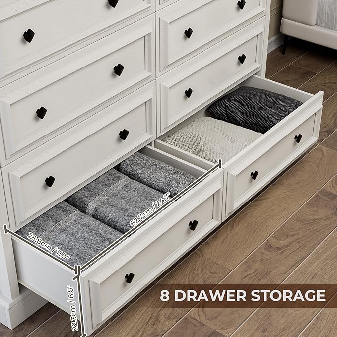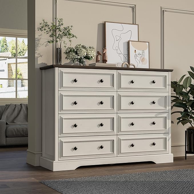 - Exquisite Farmhouse Design: This 8 drawer dresser features a classic rustic farmhouse look that effortlessly complements any home decor. The distressed wood finish, combined with wrought iron handles, creates a charming and nostalgic atmosphere, making it a standout piece in your bedroom, living room, or hallway. It brings the warmth and simplicity of country living right into your space.