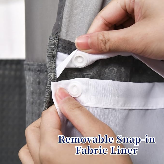 - ⭐️[Easy To Care]:This textile hotel shower curtain with detachable liner can be easily cared with machine wash or hand wash.This 71W X 86H inch snap shower curtain with 50" W x 66"H attached replacement cloth inner liners fits for any standard size shower,bathtubs,clawfoot tub and straight or curved shower rods