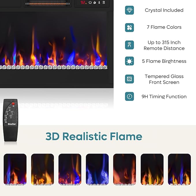 - TV STAND WITH FIREPLACE - This fireplace with timer can warm a 400 square foot room fast for the perfect temperature from 62°F to 92°F. Overheat protection ensures that you can use it safely. It has 5 adjustable flame colors and 5 levels dimmer and the heat function and flame display can be turned on separately.