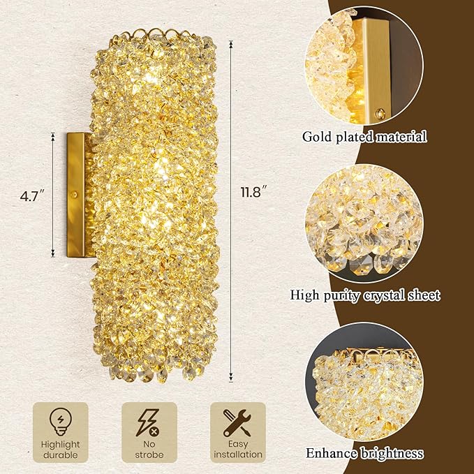 - High-quality: The K9 crystals of this gold wall lamp have been multifaceted to create diamond-like angles, enhancing light refraction - providing a luxurious light and shadow effect. Also with the exquisite plating process, it is durable and long-lasting.