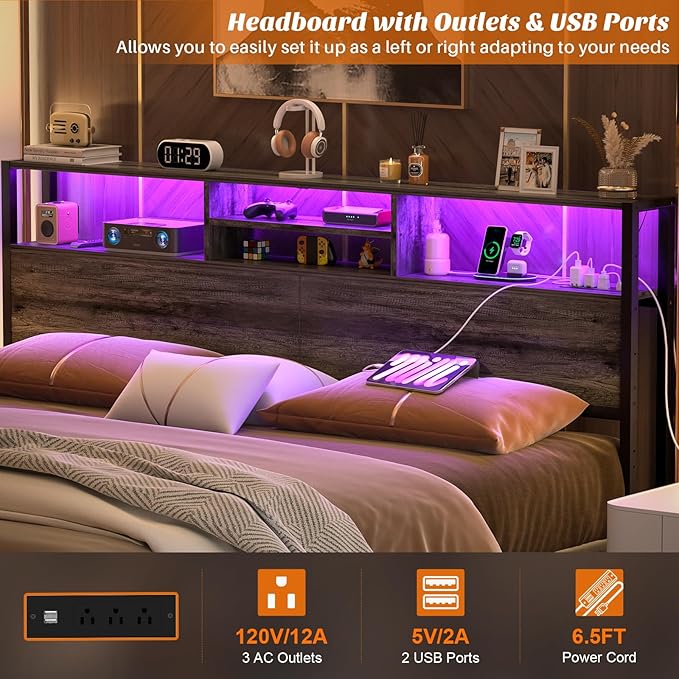 Aheaplus Headboard for King Size Bed with Storage, Headboards with Outlets, USB Ports and LED Light, King Size Head Board Only, Height Adjustable, Reversible, Sturdy and Stable Headboard, Black Oak