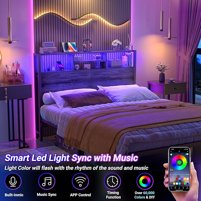 - 【Atmosphere Headboard with Smart Led Light】Our LED headboard features over 60,000 colors and multiple flashing modes to choose from. Led lights built-in music sync function can change the lights color with the rhythm of the sound and music. Sync the lights to your music's beat or set a timer for the perfect ambiance. Try to DIY your room, to match any interior theme and aesthetic.