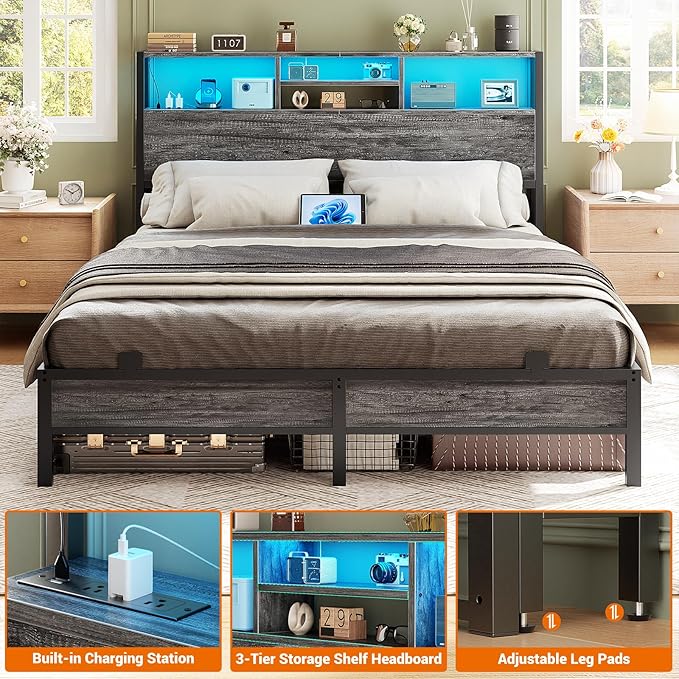 - 【3-Tier Shelf and Reversible Design】Exquisite wood panel with black iron frame showcases a strong retro color. The queen headboard also has 3-tier storage shelves for storing books, phones, a clock, or some private stuffs, which is convenient and practical. creating a clean and comfortable sleeping environment. With reversible design, the charging station can be installed in left or right directions according to your needs.