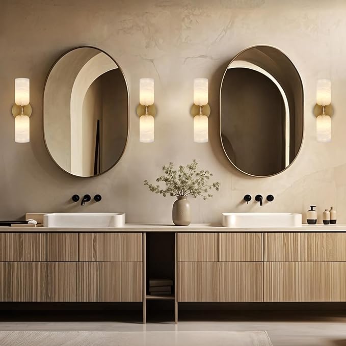 - The Perfect Combination of Classical and Modern Style: In order to maintain a better texture in bathroom lamp, we used copper to make the metal part of the alabaster wall sconce. Compared with iron, copper will have higher stability and durability.The combination of stone and copper imported from spain shows the luxurious texture in a low-key manner. Very suitable as wall decor for bathroom, wall decor living room, wall decor for bedroom, bedside tables, corridors.