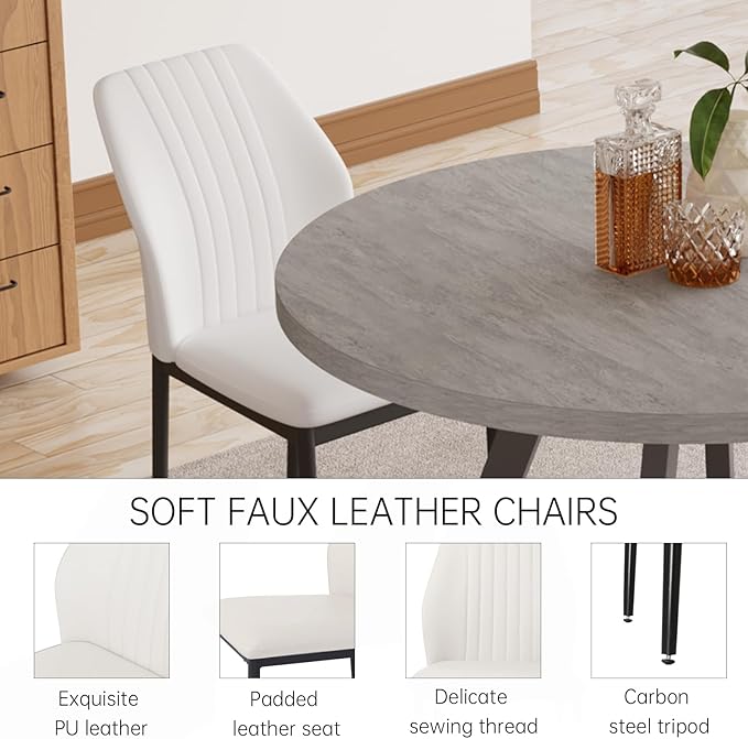 - Stylish Round Table Set: This modern dining set features a stylish round table crafted from sturdy MDF material with a unique textured finish, along with 2 comfortable PU leather chairs with ergonomic curved backs.