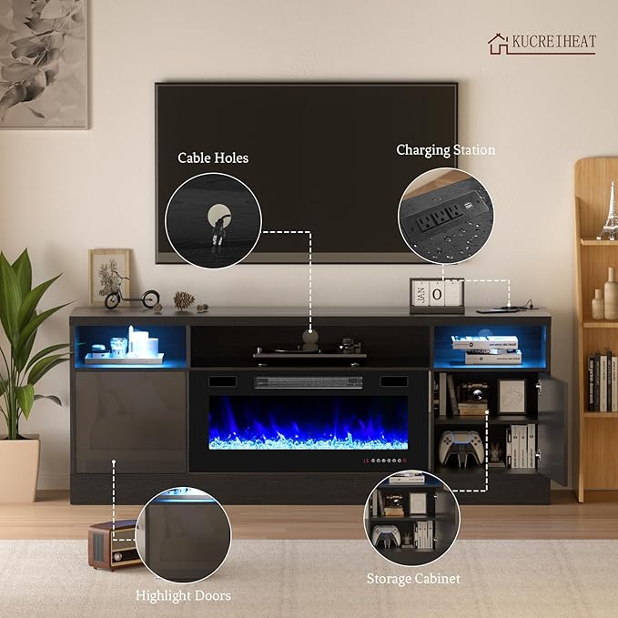 - Elegant TV Stand with Fireplace: Combine a sleek 70" TV cabinet with a cozy 36" electric fireplace, fits TVs up to 75 inches, suitable for living room, bedroom. It provides plenty of storage space with 3 open shelves and 2 large cabinets. Make your home more charming with this TV stand.